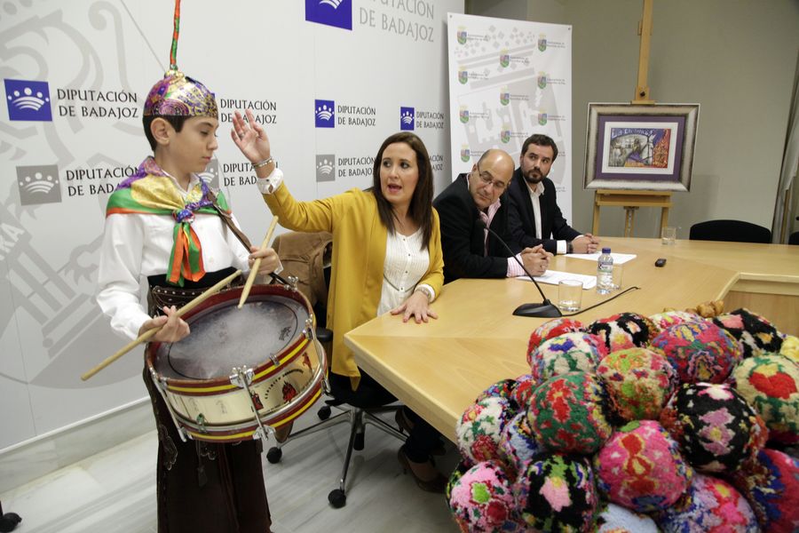 En la presentación de esta fiesta, Reyes Asensio ha explicado cuál es la vestimenta de los jinetes, compuesta por camisa blanca, pantalón, faja, pañuelo multicolor, zahones, botas camperas y el característico gorro puntiagudo y ha presentado la «manta guapa», un elemento decorativo elaborado por artesanas de Navalvillar que se utiliza para engalanar los caballos.